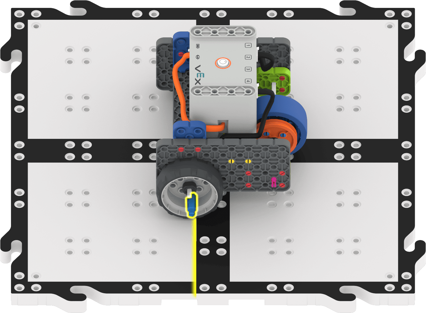 أولاً، أظهر لهم كيفية وضع الروبوت الخاص بهم في نقطة البداية كما هو موضح في الصورة أدناه. استخدم المباعدة الزرقاء الموجودة على العجلة للمساعدة في محاذاة مركز العجلة مع الحافة الأمامية لخط البداية.
